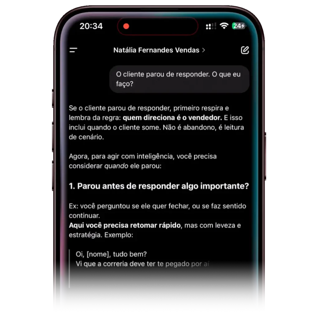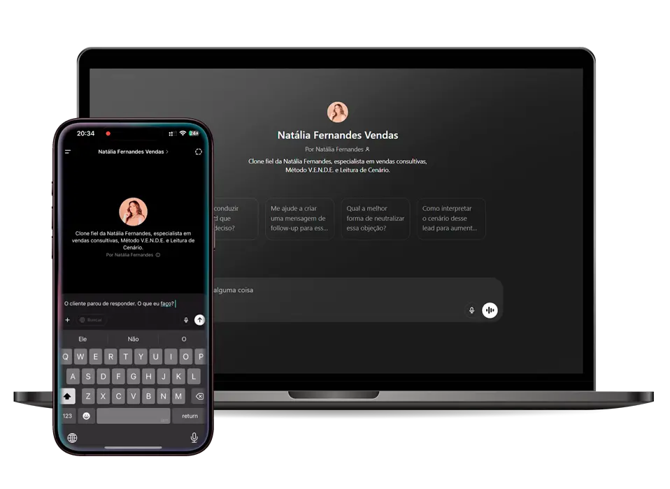 Sim. O VendAI foi treinado com mais de 15 anos de experiência real da Natália Fernandes, especialista em vendas B2B, neurovendas e estruturação comercial. Não é uma IA qualquer. É uma versão estratégica da Nat, no seu bolso (no computador, ou celular – você decide).